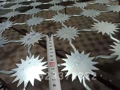 梅花刺片規(guī)格 | 直徑不小于7.5cm,刺片厚1.5mm,采用Q235低碳鋼板沖壓成型。梅花刺片用氬弧焊將梅花形刺片焊接在美格網(wǎng)的節(jié)點上,形成刺形保護(hù),有效的防止了手握腳攀。 |